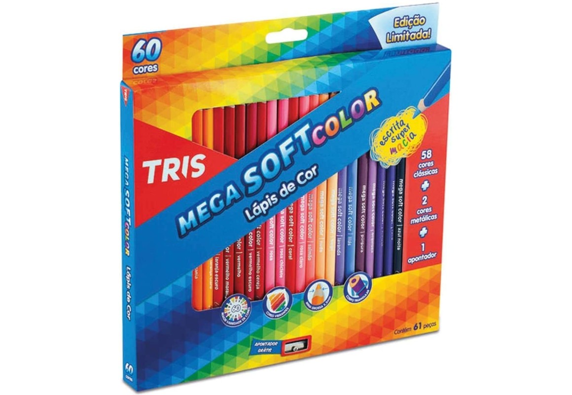 Lápis De Cor TRIS Mega Soft Color 60 Cores Cores vibrantes; Traço super macio; Corpo triangular; Acompanha 2 lápis metálicos e apontador Conjunto com 60 unidades