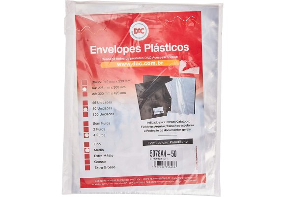 ENVELOPE PLASTICO DAC 4 FUROS A4 MEDIO PCT 50 UNI